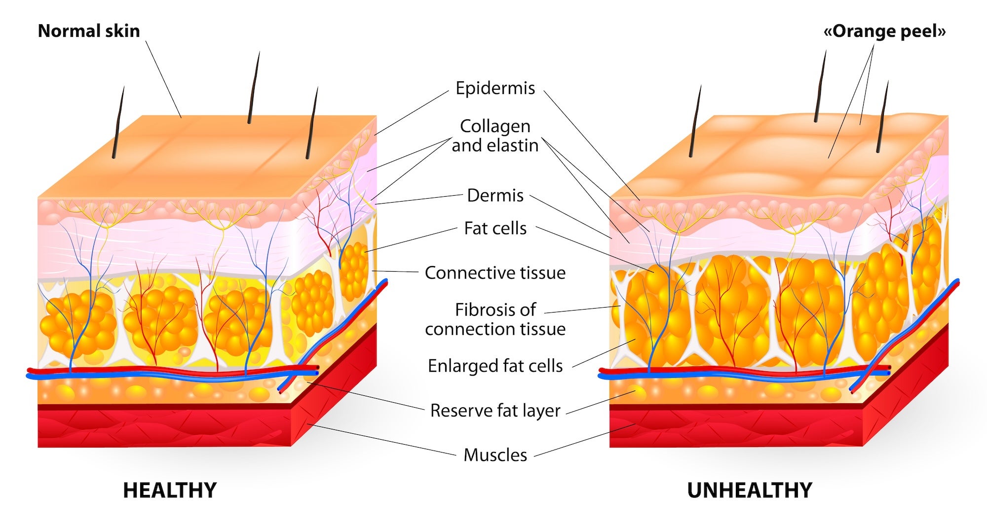 Underneath the skin layer are adipose cells ("fat cells"). Think of them like water balloons that fill and empty. If we have gained weight, our fat cells have filled more; if we lose weight, the balloons deflate. Those fat cells are always present - when we “lose fat,” we actually don’t get rid of the fat cells; they just shrink.