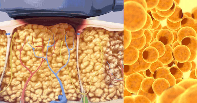 Ultrasonic cavitation uses low-frequency ultrasonic waves to penetrate beneath the skin layer and precisely target underlying adipose ("fat") cells, causing them to vibrate intensely and break apart. Each ultrasonic wave has a high and low-pressure cycle. As the low-pressure cycle enters the underlying fat tissue, tiny gas bubbles ("voids") form in the surrounding fluid of the fat cells. This formation of microscopic bubbles is called cavitation. With each ultrasonic wave, those bubbles stretch until they ultimately implode. This implosion vibrates and pressures the surrounding fat cells by disrupting their membranes, which forces them to release their contents - such as fatty acids & triglycerides - into the body. The released content is then metabolized and eliminated from the body through natural processes, such as the lymphatic system and liver.